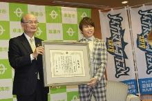 滋賀ふるさと観光大使で滋賀県出身の西川さんは、音楽を通じて地元へ恩返しをしたいとの想いから、2009年よりイナズマロックフェスを草津市で開催されています。本日は、西川さんが市役所を表敬訪問され、琵琶湖の環境保全のためにと収益金の一部を寄付してくださいました。また、西川さんのこれまでの御貢献に感謝して、私から感謝状を贈呈させていただきました。