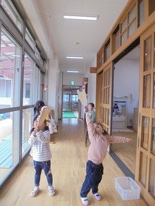 お正月にちなんだ伝承遊びを取り入れ、こま回し、すごろく、けん玉、凧揚げ、羽子板、カルタなど様々な遊びに親しみました。どのこどもも楽しめるよう、遊び方を工夫したり、いろいろな伝承遊びを経験できる環境づくりを大切にしています。日本の伝統文化に触れるこれらの遊びを大切にする気持ちが心の中で育まれ、未来へとつながっていくことを願っています。