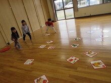 5歳児はクラスみんなで大型カルタとりに挑戦!