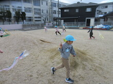 4歳児は袋を活用し、園庭で凧揚げ