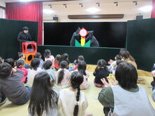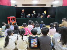 続いて「ねずみの嫁入り」の人形劇、「くまちゃん幼稚園」では、パペットたちが楽器をもって音楽に合わせて動き、こどもたちはお話の世界に夢中になって見入っていました。