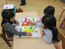 4歳児にじ組のこどもたちを対象に幼児課の栄養士と看護師と一緒に「三大栄養素(赤・黄・緑)」についての食育集会を行いました。パワーポイントで赤・黄・緑の役割を知り、こどもたちはグループに分かれ、食べ物を見ながら、表に色分けする活動を楽しみました。