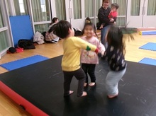 後半、マットでの前転や鉄棒の足抜き回りの導入のタイミングや介助の仕方など、実践を交えて丁寧に教えていただき、親子で協力してチャレンジしたりしました。また、友だちと手をつないでエアトランポリンでジャンプする楽しさを知ると、誘い合って遊ぶ姿がありました。こども同士で友だちの名前を呼んだり、保護者同士が笑顔で会話する姿もあり、はらっぱでの人とのつながりが深まったことを感じることができました!