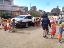 不審者訓練の後、パトカーが入ってきました。「中はどうなっているのかな?」興味津々です。