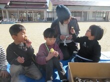 以前収穫したサツマイモで焼き芋パーティーをしました。自分たちで芋を洗って、濡らした新聞紙とアルミホイルに巻いたら準備OK!「おいしくなあれ!」と火起こししたドラム缶に投入します。焼き上がりを楽しみにして待っていたこどもたち。できあがった焼き芋を満面の笑顔でほおばりました。当日は10月の収穫でお世話になった中瀬様も来てくださり、みんなでい一緒に「おいしいね!」と食べた焼き芋の味は格別でした。