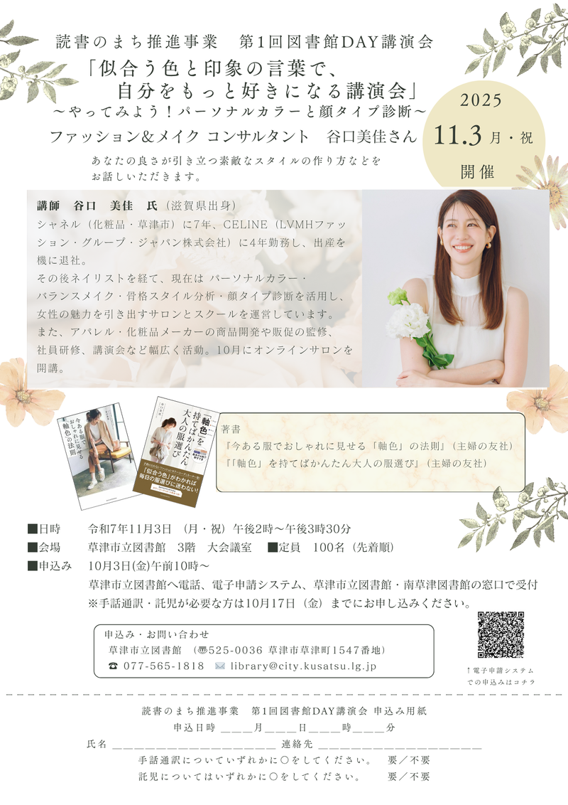 読書のまち推進事業 第1回図書館DAY講演会「似合う色と印象の言葉で、自分をもっと好きになる講演会」 やってみよう!パーソナルカラーと顔タイプ診断 を開催します!