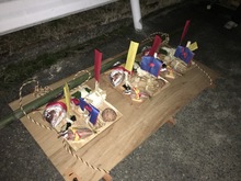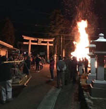 神社では左義長に火がつけられ、神社に行列が到着すると、供え物が決められた場所に捧げられます。
