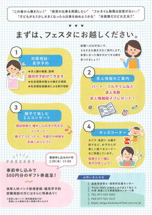 - 社会保険労務士による働き方相談・社会福祉協議会の貸付相談ブース復職に向けて働き方に関する不安を相談できます。就職準備金や保育料の一部貸付等の支援制度の相談ブースもあります。