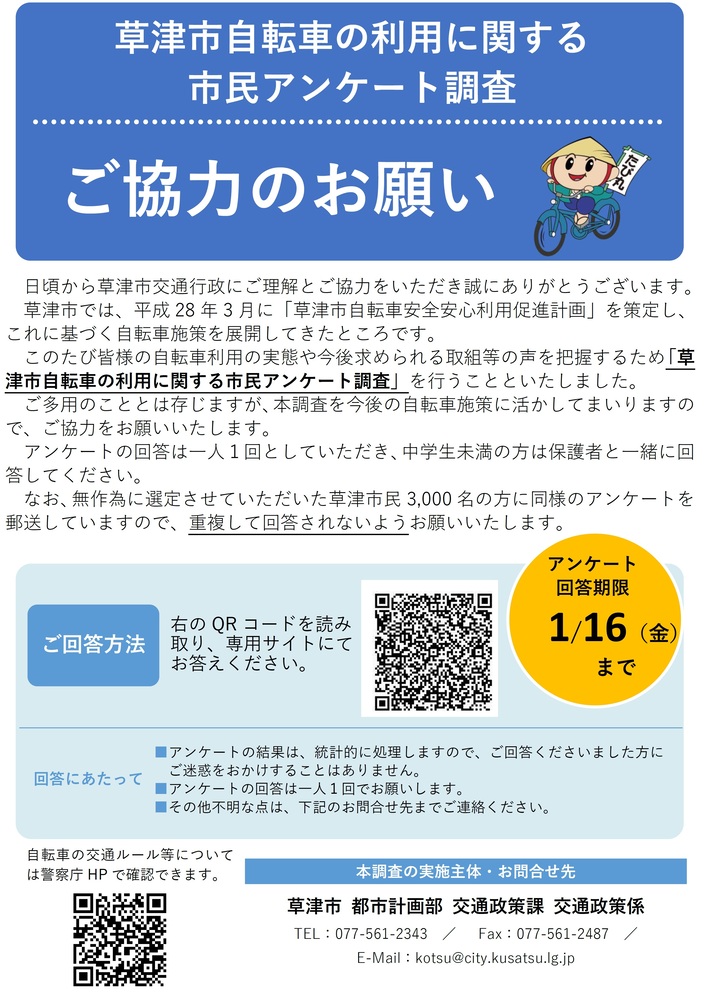 本調査を今後の自転車施策に活かしてまいりますので、ご協力をお願いいたします。
