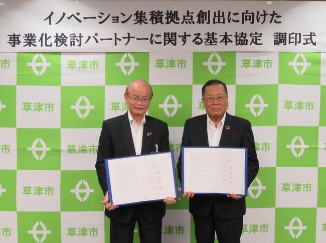 調印式(左:草津市 橋川市長、右:滋賀銀行 久保田頭取)