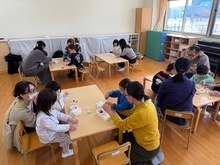 今回はひだまりルームでマラカス作りを楽しみました。小さなペットボトルの周りに、シールやテープで飾り付けをして、その中にどんぐりなどを入れた後に、紐を付けて完成しました。マラカスにシールをたくさん貼ったり、上手にどんぐりをつまんで入れたりと、お家の人と一緒に楽しみながら作り、素敵なマラカスが沢山できました。出来上がった後はみんなで「どんぐりころころ」を歌って楽器を鳴らし、楽しみました。