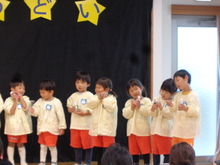 3歳児はお家の人の前で元気いっぱい歌を歌って、手作りの楽器を手にしてリズムを感じながら楽しい時間を過ごしました。