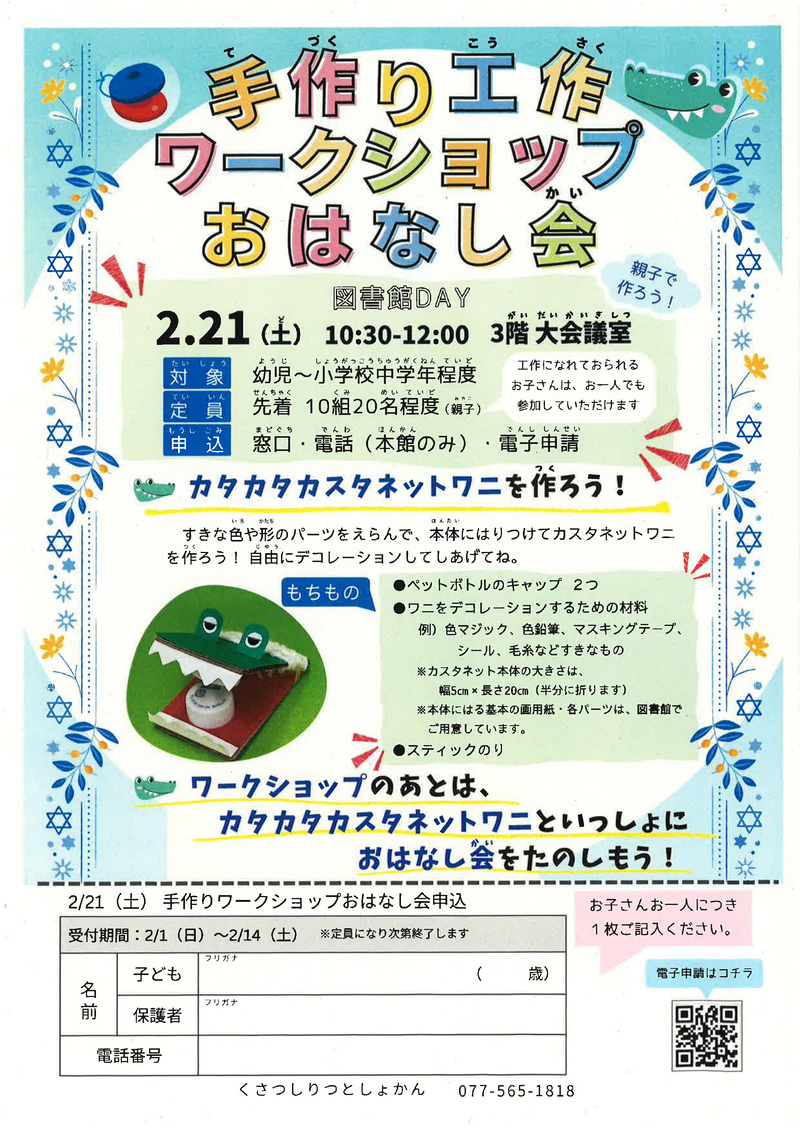 内容:すきな色や形のパーツをえらんで、本体にはりつけてカスタネットワニを作るワークショップです。ワークショップのあとは、カスタネットワニといっしょにおはなし会を楽しみましょう。